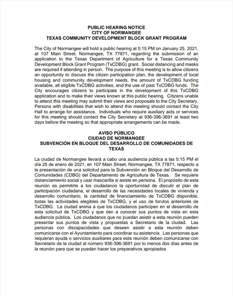 Public Hearing 1/25/2021 @ 5:15pm, Notice posted at City Hall and in Normangee Star